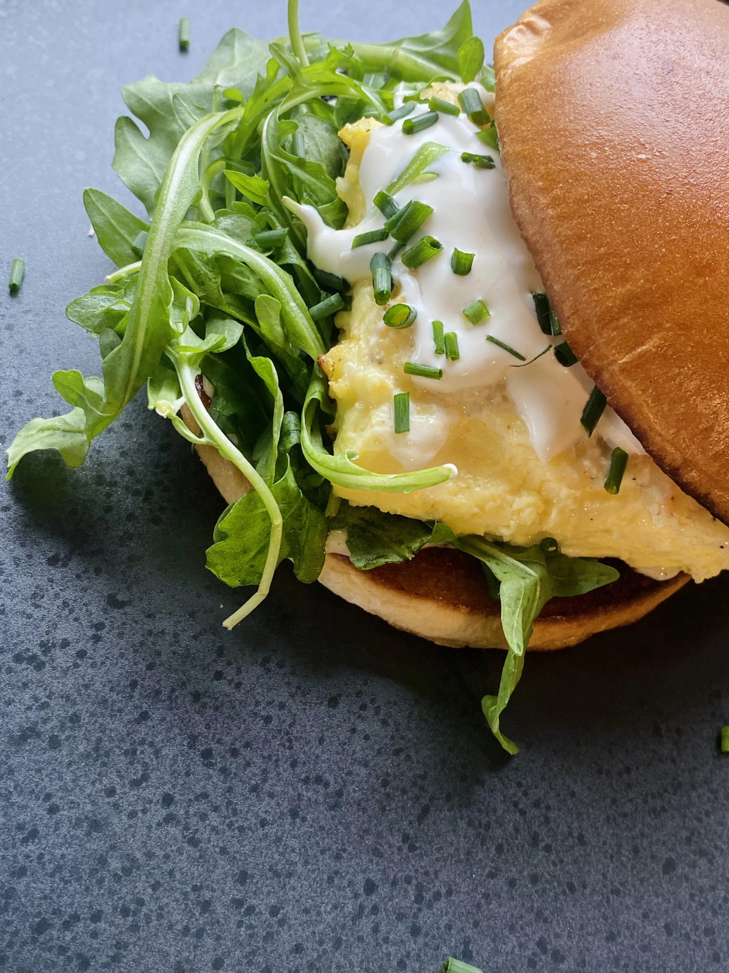 Toasted brioche sandwich with sage aioli, arugula, and a soft-baked cheesy egg with crème fraîche and green onion. | Add bacon +$3.