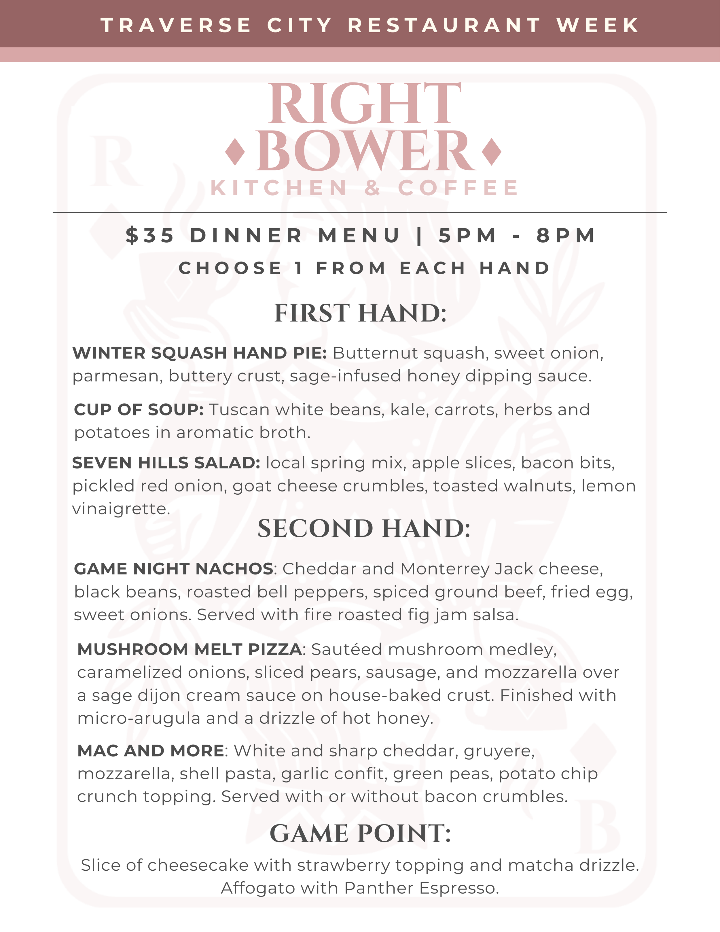 For Restaurant Week Only… Dinner service every day! 5pm - 8pmCheck out this special menu, live during Traverse City Restaurant Week! Make a dinner reservation so we know you’re coming!